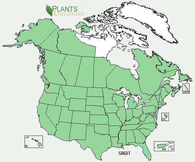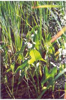 So called from the shape of its leaves. An aquatic plant with arrow-shaped leaves and potato like tubers in the mud. It is found in swamps, ditches, ponds and shallow waters very generally throughout North America from the Atlantic to the Pacific and from Canada to Mexico, flowering in summer with 3-petaled white blossoms arranged in verticels of three. Seeds ripen from August to September. Tubers are egg shaped ranging from 1 to 2 inches in length developing at the ends of slender roots.